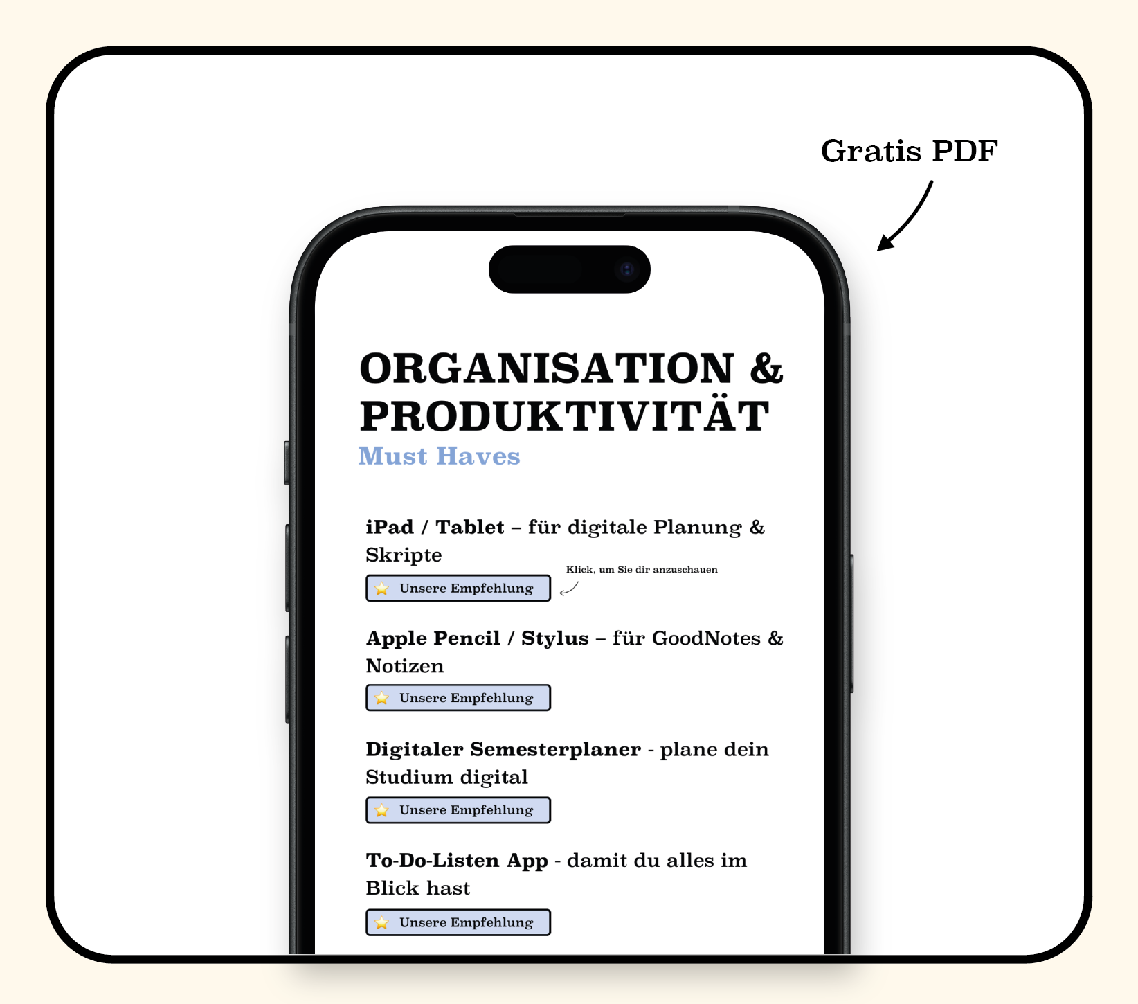 Die Liste richtet sich an alle Studierenden (oder die es bald sind), die mehr Struktur, Fokus und Erleichterung im Alltag wollen – egal ob Ersti oder im Master.